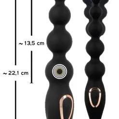 De anaal vibrator Anal Beads with Vibration van ANOS is in een bead design en heeft een flexibele punt. De 7 vibratiestanden zorgen voor opwindend achterdeurplezier. De standen zijn eenvoudig aan te passen met de knop op het speeltje. Door de brede basis met de praktische ophaalring kan hij naar de juiste hotspots worden geleid en voorkomt hij dat de kralen te ver naar binnen glijden. Je kunt er ook van genieten in bad of onder de douche omdat het waterdicht is. De siliconen vibrator is bedekt met een zachte textuur die heerlijk aanvoelt op de huid tijdens anaal genot. Hij kan worden opgeladen met de meegeleverde USB-kabel.