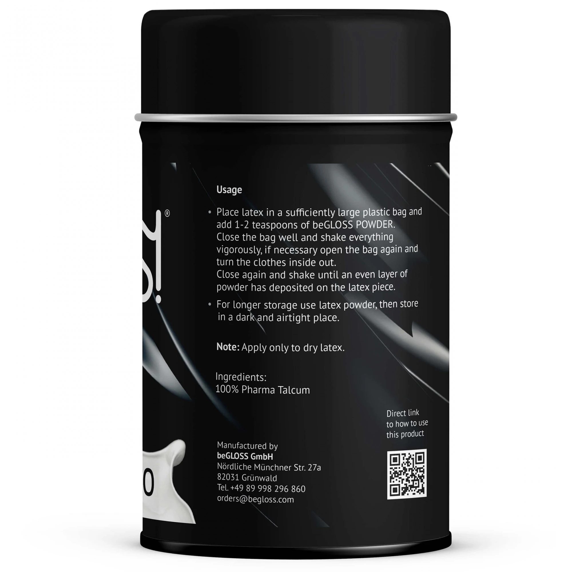 Als je van latex houdt, gebruik dan beGLOSS Talkpoeder. Het is van zeer hoge kwaliteit en vrij van toevoegingen of andere ingrediënten die de structuur van het hoogwaardige materiaal kunnen aantasten of oplossen. We raden daarom aan om geen huishoudpoeders, babypoeders of zelfs industriële poeders te gebruiken.