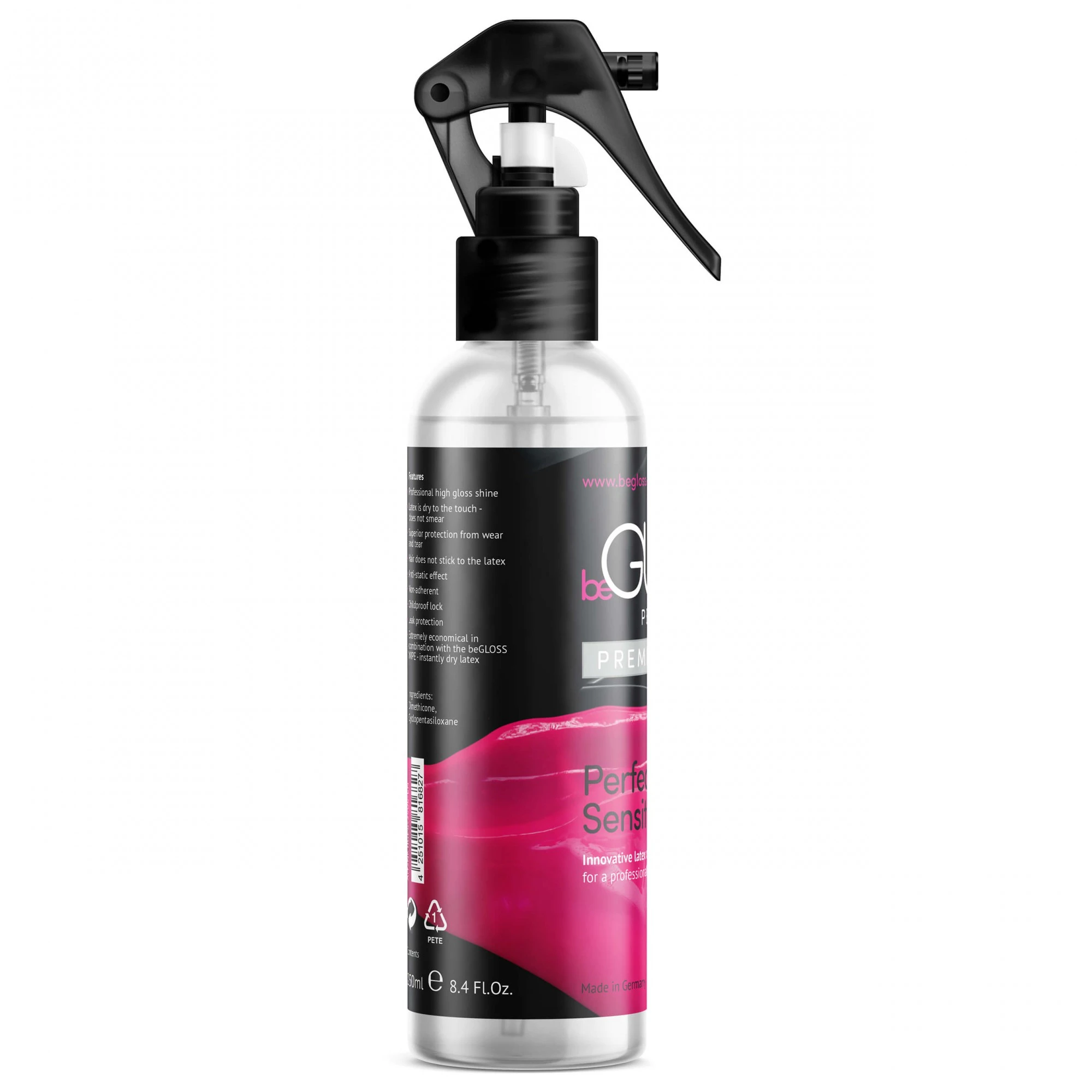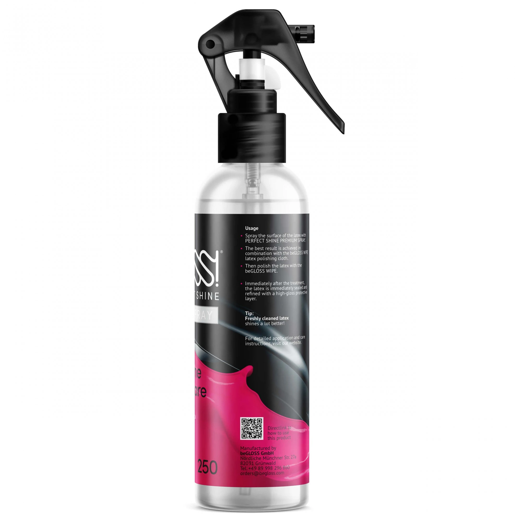 De perfecte polish en verzorging voor latex kleding. beGLOSS heeft een revolutie teweeggebracht in het verzorgen en polijsten van latex. Onze innovatieve samenstelling zorgt voor een volledig droge hoogglans latex glans en voorkomt effectief dat het haar blijft plakken in de latexolie van de kleding. Het heeft een antistatisch effect. Ga zorgeloos op meubels zitten, want beGLOSS Perfect Shine Premium Spray is bestand tegen vegen bij aanraking.