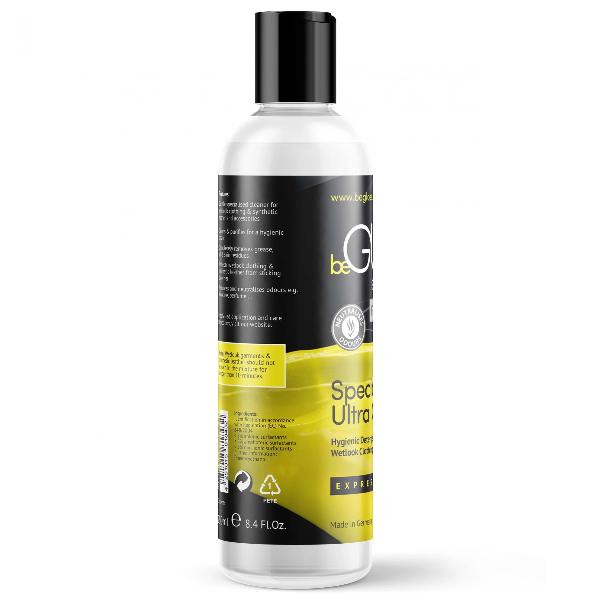 Het verwijdert vuil-, huid- en vetresten van kunstleren kleding. Het wasmiddel reinigt, verzorgt en beschermt in slechts enkele minuten. Het snelle speciale reinigingsproces is een perfecte kunstleerverzorging om de levensduur van kunstlederen kleding te verlengen. Kunstleerverzorging met de beGLOSS Special Wash kunstleerwasmiddel De juiste kunstleerverzorging met onze innovatieve reiniger, zodat zelfs hardnekkig vuil kan worden verwijderd.