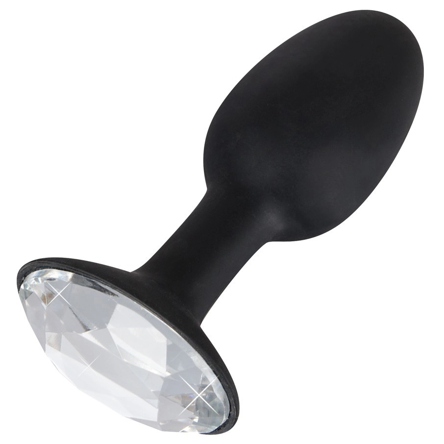 Het anal juweeltje! Buigzame anale plug in eivorm met kleurloos juweel op het einde. Zwart. Totale lengte 11cm, Ø 1,1 – 2,8 cm. Materiaal: silicone, acryl.