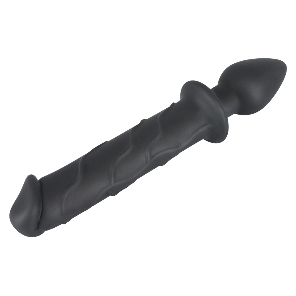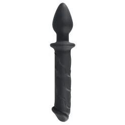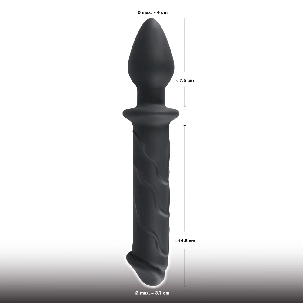 This magnificent dildo means double the fun – one end is for vaginal penetration, the other one for anal. One end is a penis with very pronounced veins (insertion depth 14.5 cm), the other one is a cone-shaped butt plug (insertion depth 7.5 cm). The ends are separated by a stopper.
