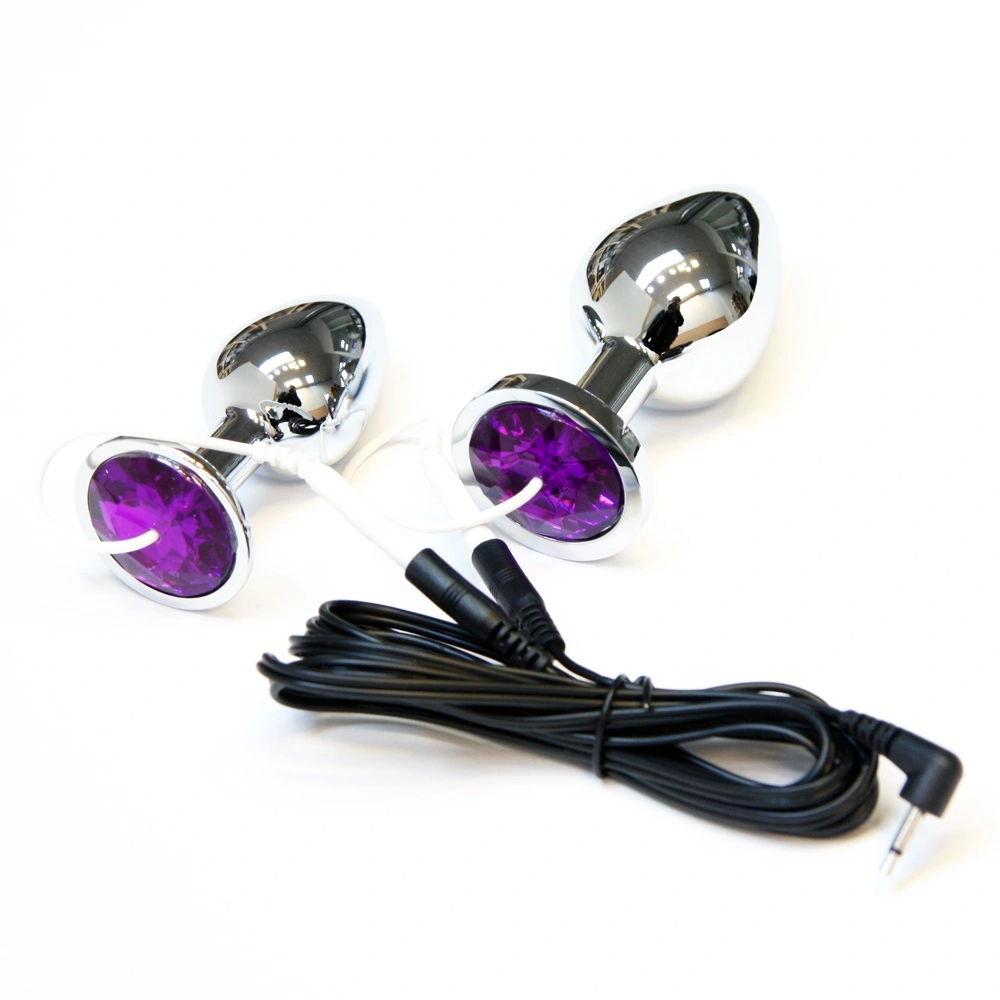Two for the price of one! Pucker up in style with two metal anal plugs featuring purple gem applications and electrical input plugs.