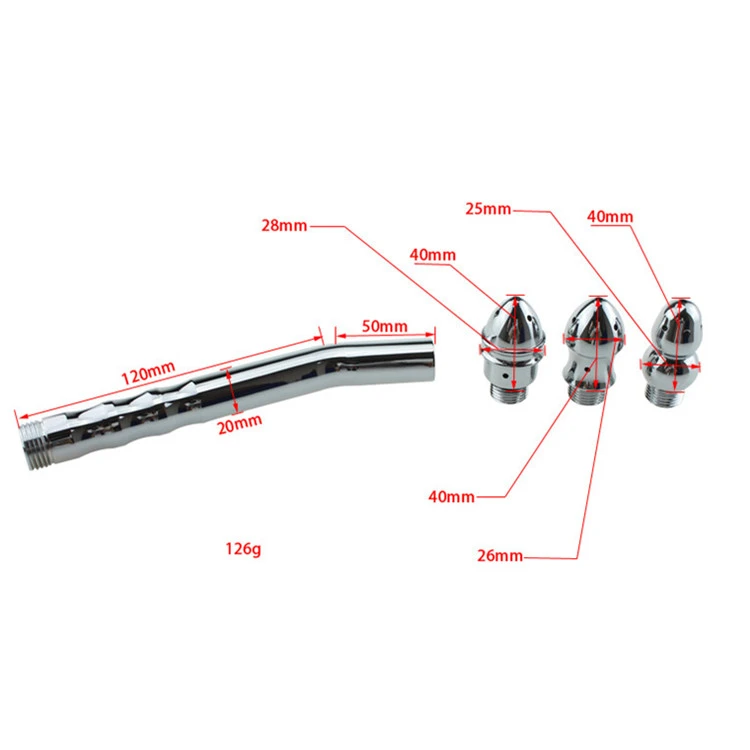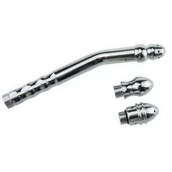 Schroef dit mondstuk op zowat elk doucheklysma-systeem om elke ronding en spleet van je anus grondiger en comfortabeler te reinigen! Of je nu doucht voor gezondheid, plezier of om je voor te bereiden op anale seks, dit opzetstuk zal de klus klaren! De punten van de meegeleverde sproeikoppen zijn taps toelopend om gemakkelijk in te brengen en zijn bolvormig voor uw plezier. Je kunt het ook gemakkelijk verwijderen om te vervangen door een andere sproeikop naar keuze. Groeven in het handvat helpen je om een veilige grip te behouden, ondanks zeep, glijmiddel en water in de douche. Het slanke, naadloze metaal is niet-poreus voor eenvoudige en grondige reiniging. Te gebruiken met glijmiddel op siliconen- of waterbasis.