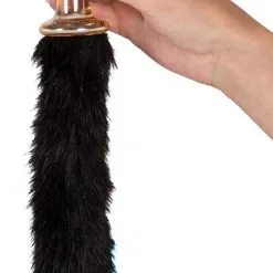 Transparante goud-kleurige, onbreekbare glazen butt plug met een zwarte nep-bont staart.