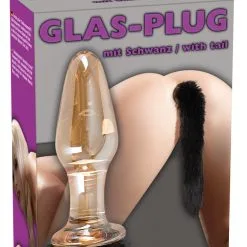Transparante goud-kleurige, onbreekbare glazen butt plug met een zwarte nep-bont staart.