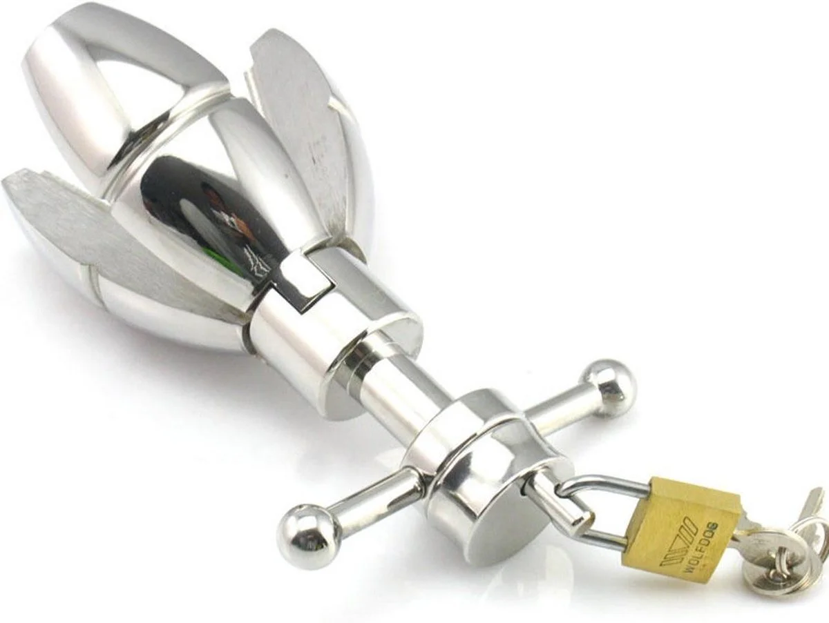 Breng de roestvrijstalen butt-plug eenvoudig in met wat glijmiddel, waarna de pen aan het uiteinde wordt uitgetrokken en de plug zich uitspreidt en stevig op zijn plaats zit.