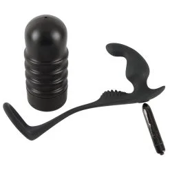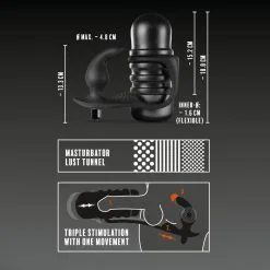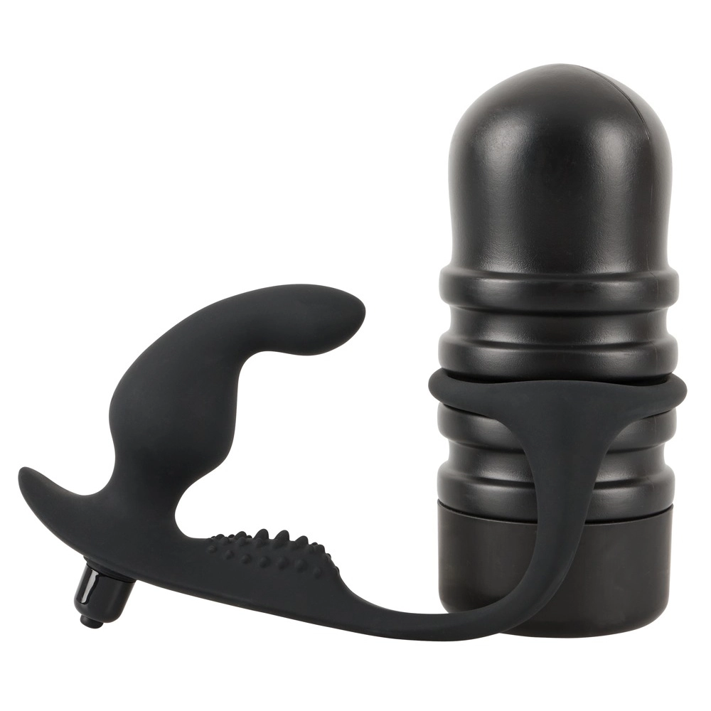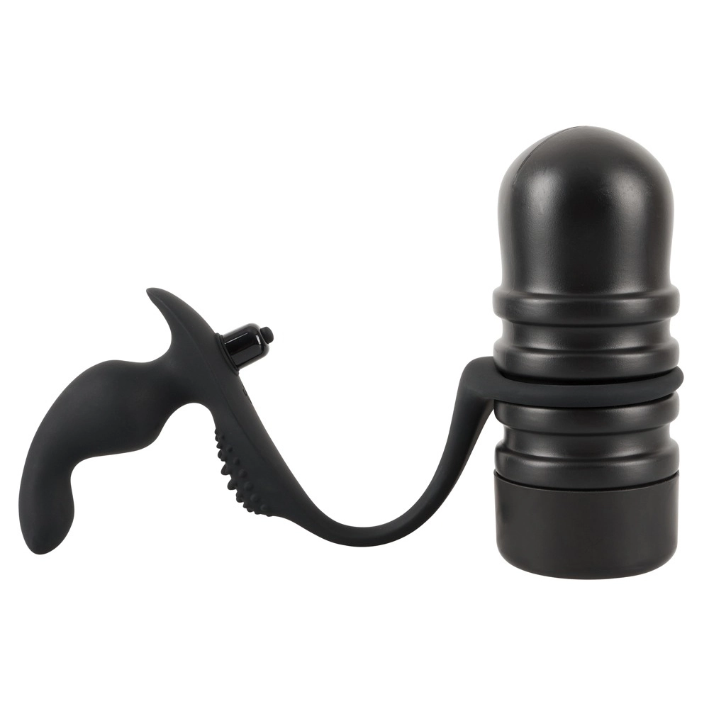 Deze masturbator heeft een open uiteinde, pleasure tunnel met noppen en groeven en kan uit de case verwijderd worden. De zwarte anale vibrator voelt zijdezacht aan, heeft 10 vibratie modussen en is specifiek ontworpen om de P-spot te stimuleren. De vibratie kogel is tevens uitneembaar. De flexibele verbindingsbrug heeft nopjes om het perineum heerlijk te stimuleren.