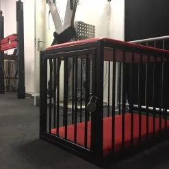 Deze kooi kan geproduceerd worden met stalen spijlen boven of met een houten plaat, opgevuld met schuimrubber en bedekt met kunstleer, zodat de kooi ook kan worden gebruikt als een bondagetafel of bijvoorbeeld om voor de Meesteres om (comfortabel!) op te zitten wanneer haar slaaf haar hoge hakken aanbidt. Daarbij is deze kooi 120 cm lang, zodat deze ook als bondagetafel voor bijvoorbeeld een hogtie gebruikt kan worden.