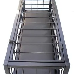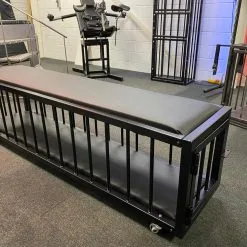 Met deze zeer solide stalen slaapkooi heeft uw sub de ideale slaap accommodatie voor de nacht (of hele dag?) Doordat de gehele bovenzijde als een deur open scharniert is de instap zeer prettig en kan uw sub zelfs zonder problemen gebonden in zijn/haar nieuwe verblijf instappen. De kooi kan met 2 hangsloten worden afgesloten. De zwarte MDF bodemplaat kan ook voorzien worden van een extra dikke schuimlaag welke met een zwarte of rode immitatieleren bekleding overtrokken kan worden.
