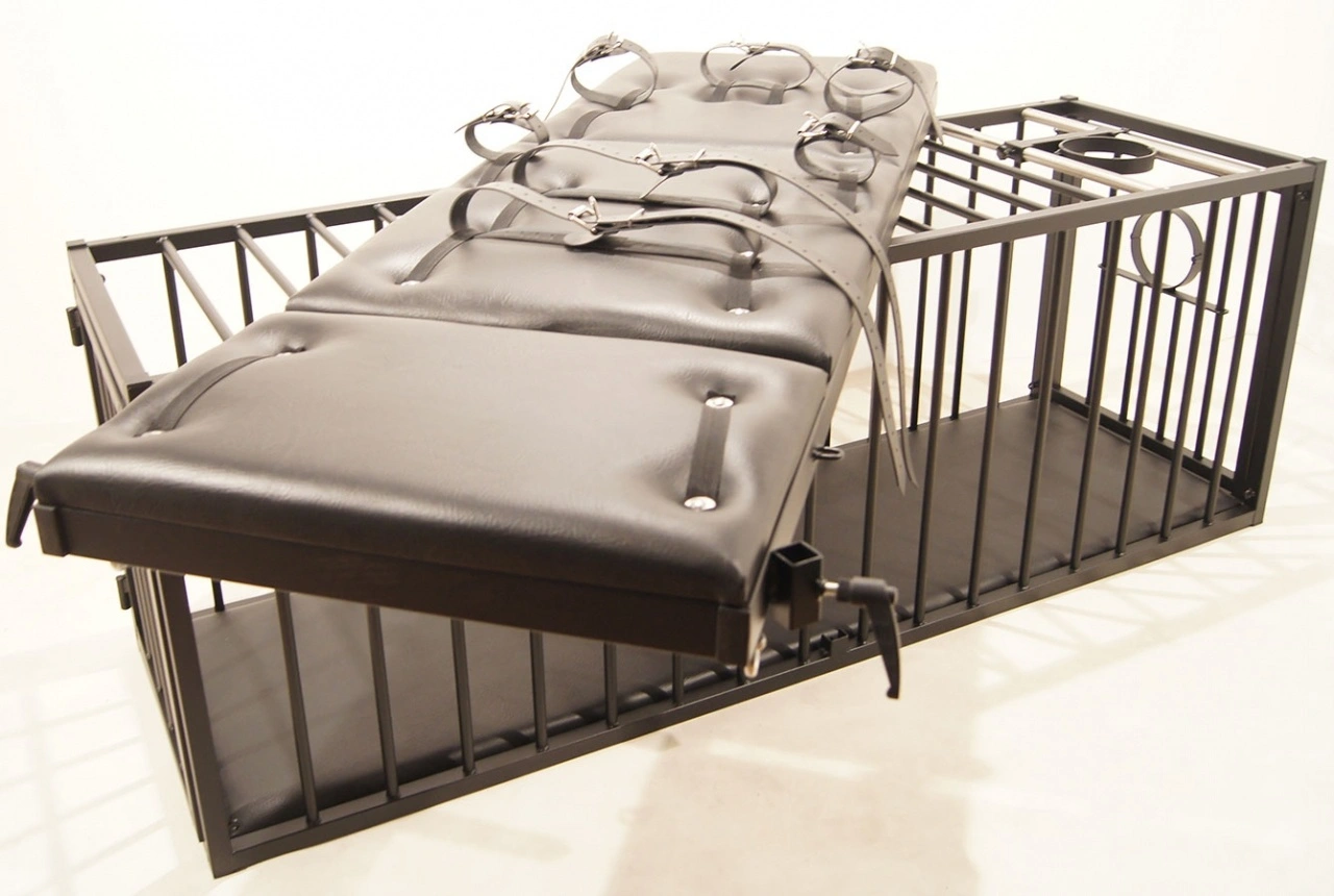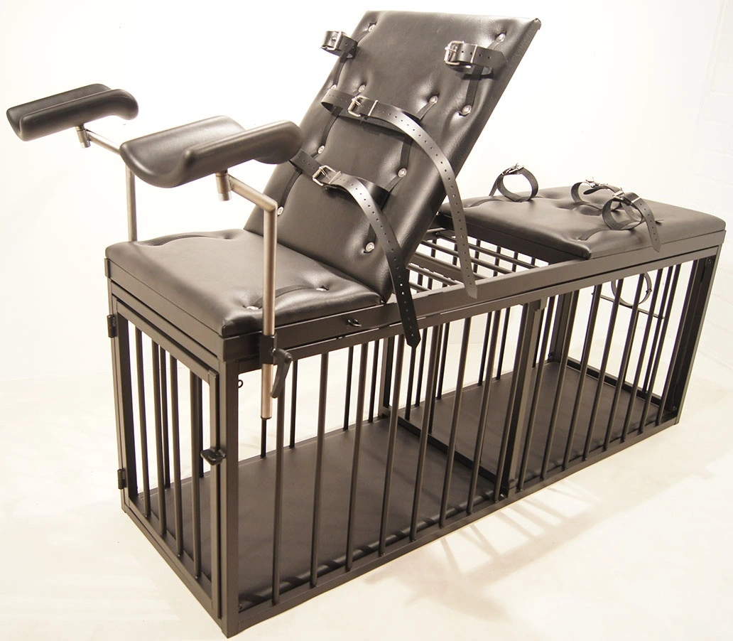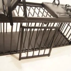 De fotos in onze BDSM Shop tonen de Multifunctionele Slavenkooi met zwarte poedercoating, met verwijderbaar matras, nylon straps met lederen riemen en gynaecologische beensteunen.