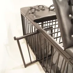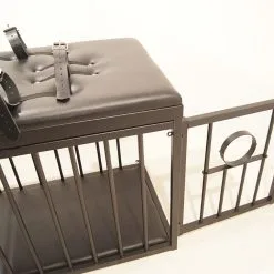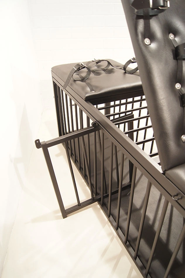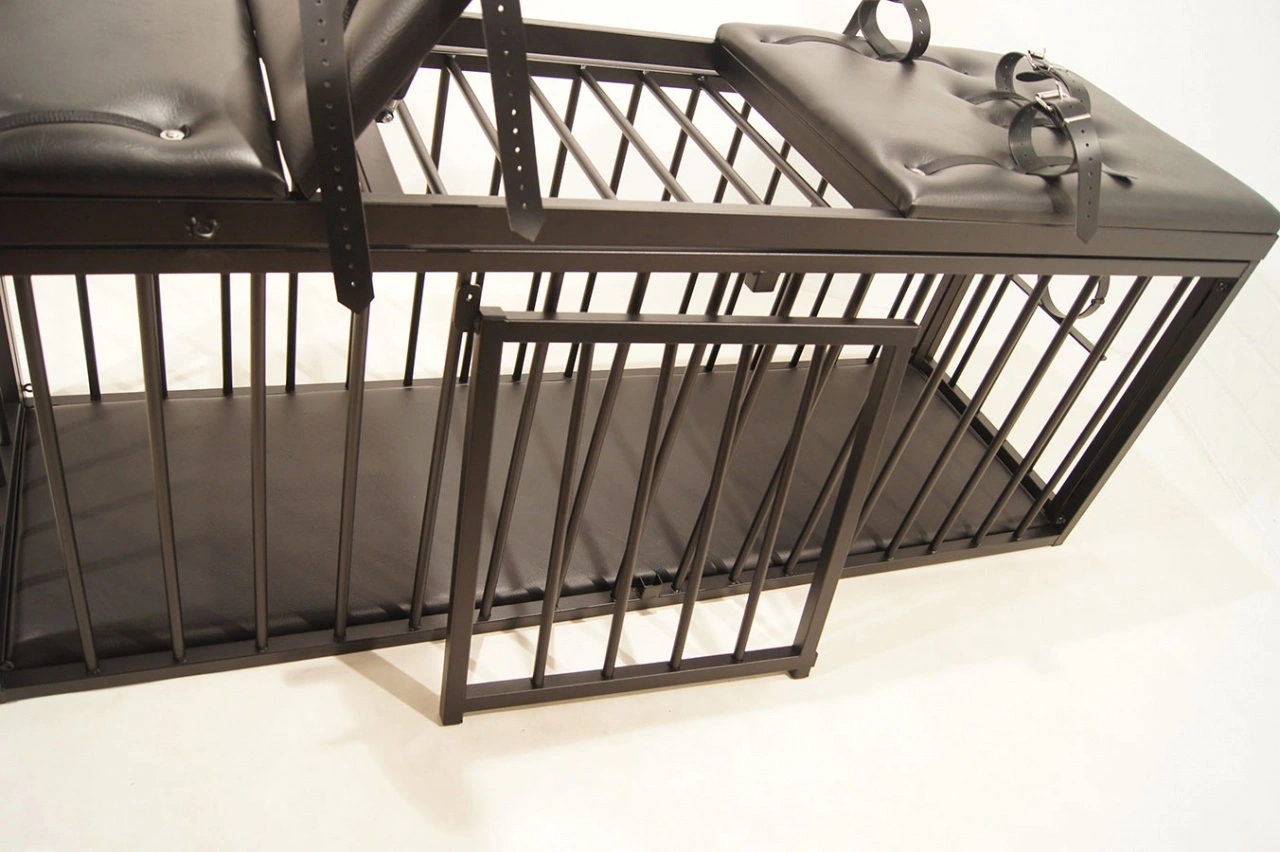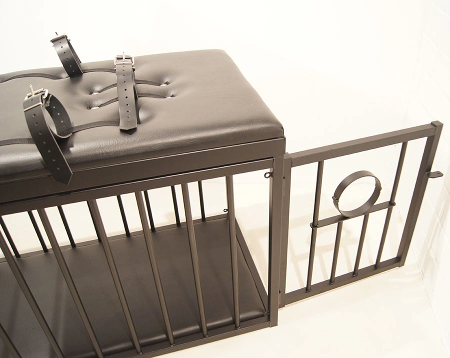 De fotos in onze BDSM Shop tonen de Multifunctionele Slavenkooi met zwarte poedercoating, met verwijderbaar matras, nylon straps met lederen riemen en gynaecologische beensteunen.
