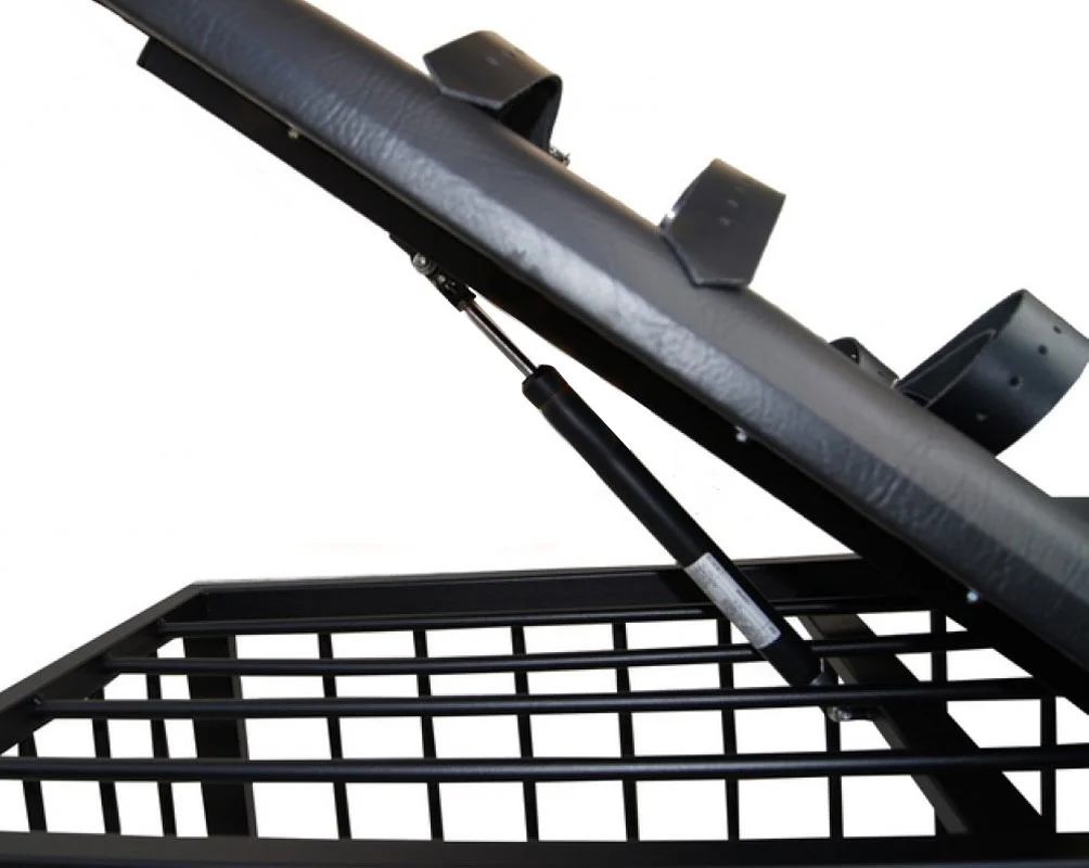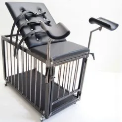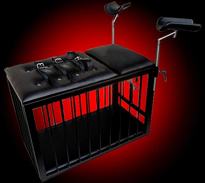 Universal usable slave cage with adjustable mattress and gynecological stirrups in stainless steel. The backrest is adjusted using a maintenance free blockable gas compression spring which can be manually adjusted steplessly by triggering a hand lever to any position. The back rest ansich can be optionally equipped with integrated Bondage belts, can be drawn through these straps for fixing the body.