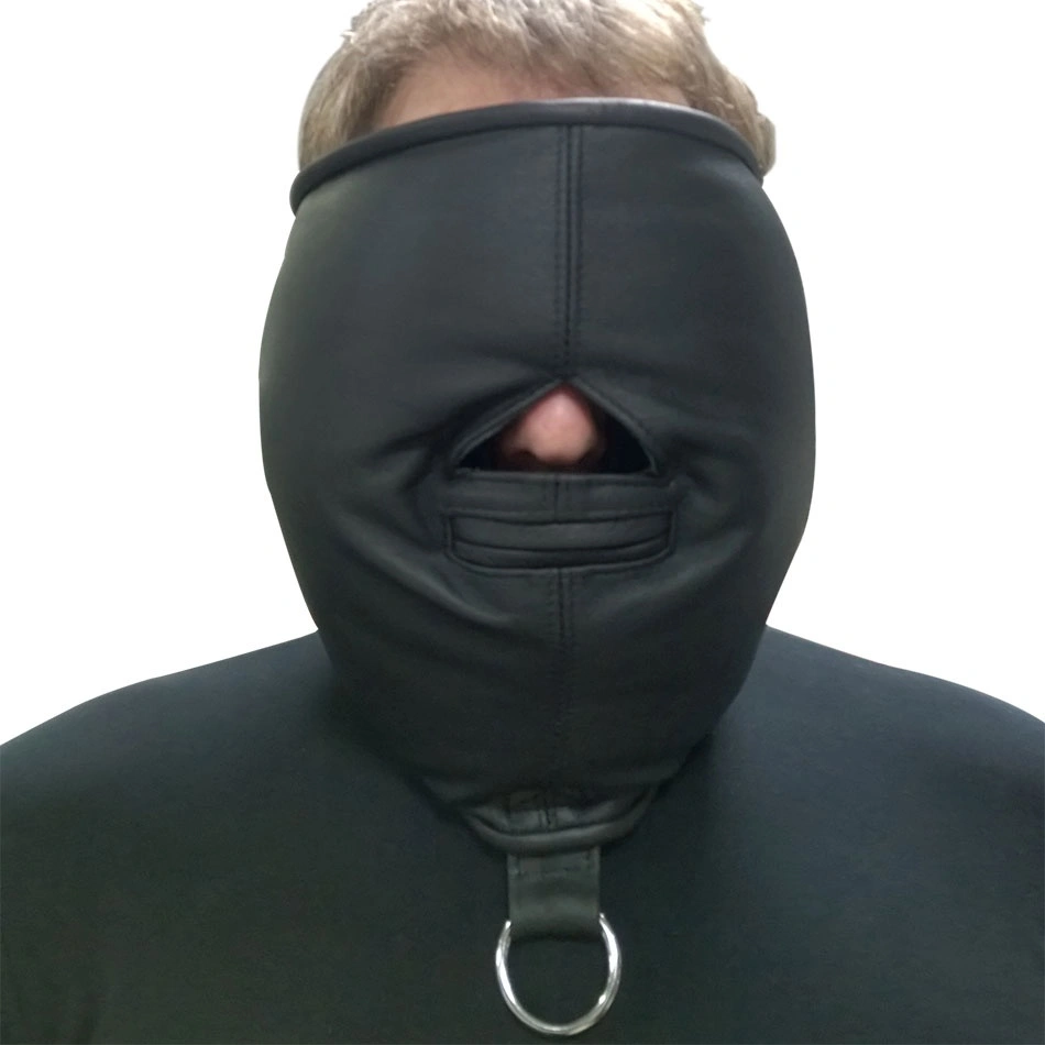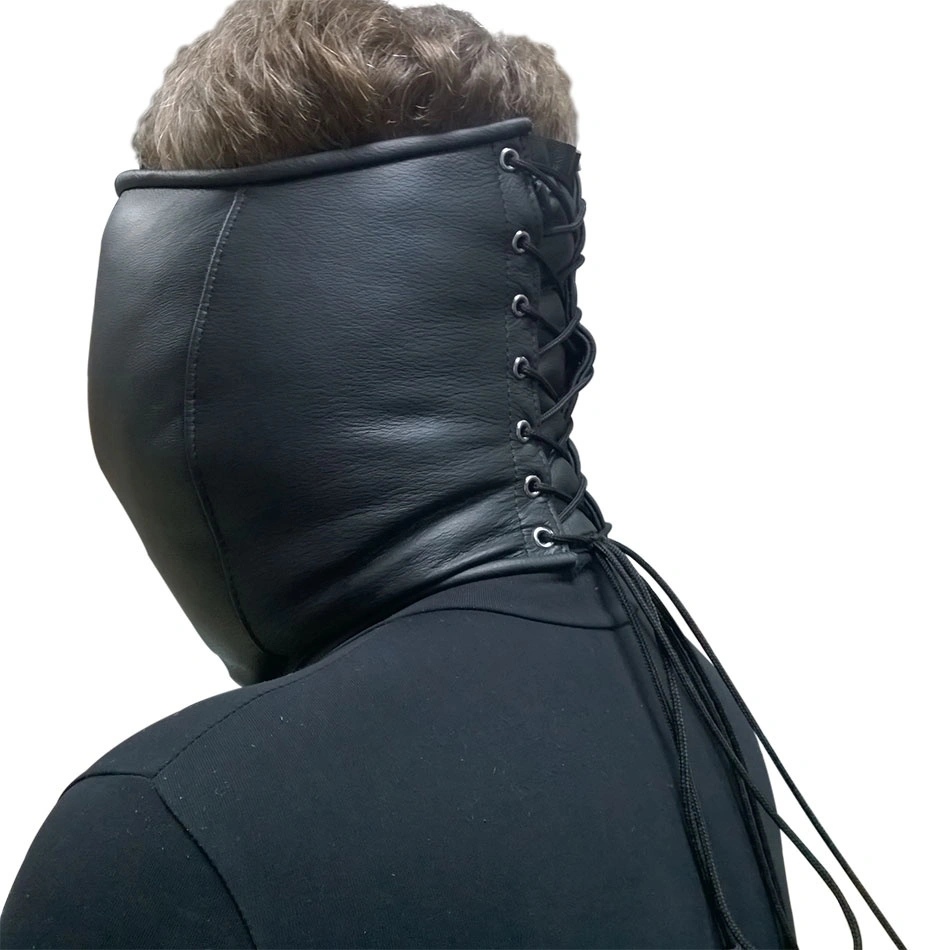 Zeer dik gevoerd en bekleed met super zacht kalfsleer en open aan de bovenkant van je hoofd, het gevoel en de geur van het echte zacht leer maakt dit isolatie masker een echte must-have!
