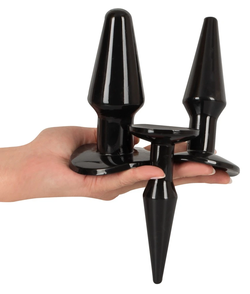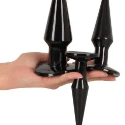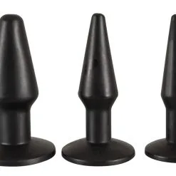 Set van drie zwarte buttpluggen met zuignap. Elke plug is ongeveer. 14 cm lang (zonder de zuignap 12 cm).
