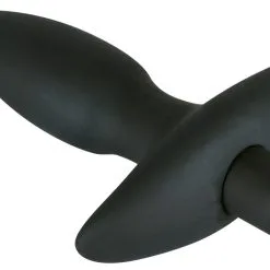 Zwarte buttplug met 5 vibratieniveaus met één druk op de knop. Met een terugtrekhandgreep. Volledige lengte 17 cm, insteekdiepte 13 cm. Ø 21 mm tot 45 mm. Materiaal: siliconen. (Batterijen a.u.b. apart bestellen: 1 x Mini penlight/AAA).