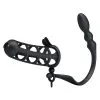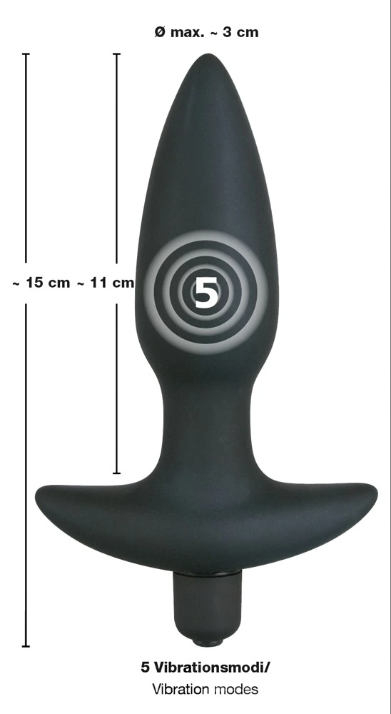 Zwarte buttplug met 5 vibratieniveaus met één druk op de knop. Met een terugtrekhandgreep. Volledige lengte 15 cm, insteekdiepte 11 cm. Ø 20 mm tot 30 mm. Materiaal: siliconen. (Batterijen a.u.b. apart bestellen: 1 x Mini penlight/AAA).