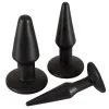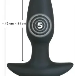 Zwarte buttplug met 5 vibratieniveaus met één druk op de knop. Met een terugtrekhandgreep. Volledige lengte 15 cm, insteekdiepte 11 cm. Ø 20 mm tot 30 mm. Materiaal: siliconen. (Batterijen a.u.b. apart bestellen: 1 x Mini penlight/AAA).