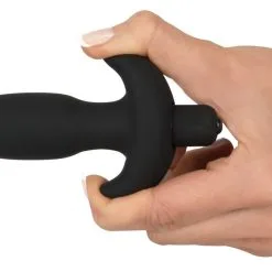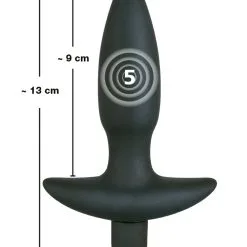 Zwarte buttplug met 5 vibratieniveaus met één druk op de knop. Met een terugtrekhandgreep. Volledige lengte 13 cm, insteekdiepte 9 cm. Ø 19 mm tot 27 mm. Materiaal: siliconen. (Batterijen a.u.b. apart bestellen: 1 x Mini penlight/AAA).