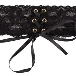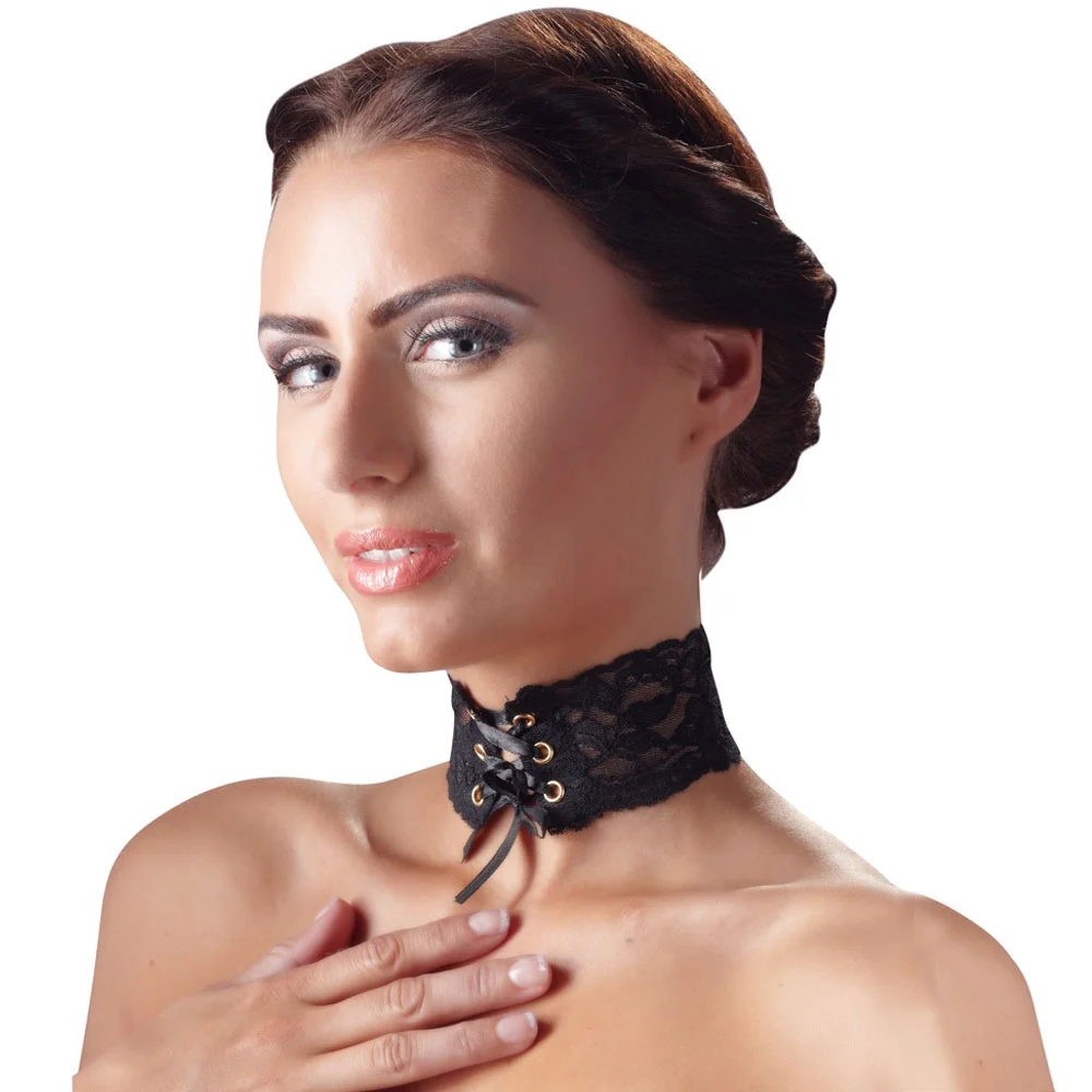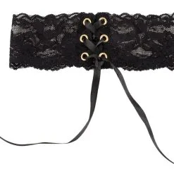 Mooie halsband van zwart kant, met 6 oogjes en satijnen lintvetersluiting voor het sluiten en aanpassen van de lengte. Sluiting kan aan de achterkant of aan de voorkant worden gedragen.